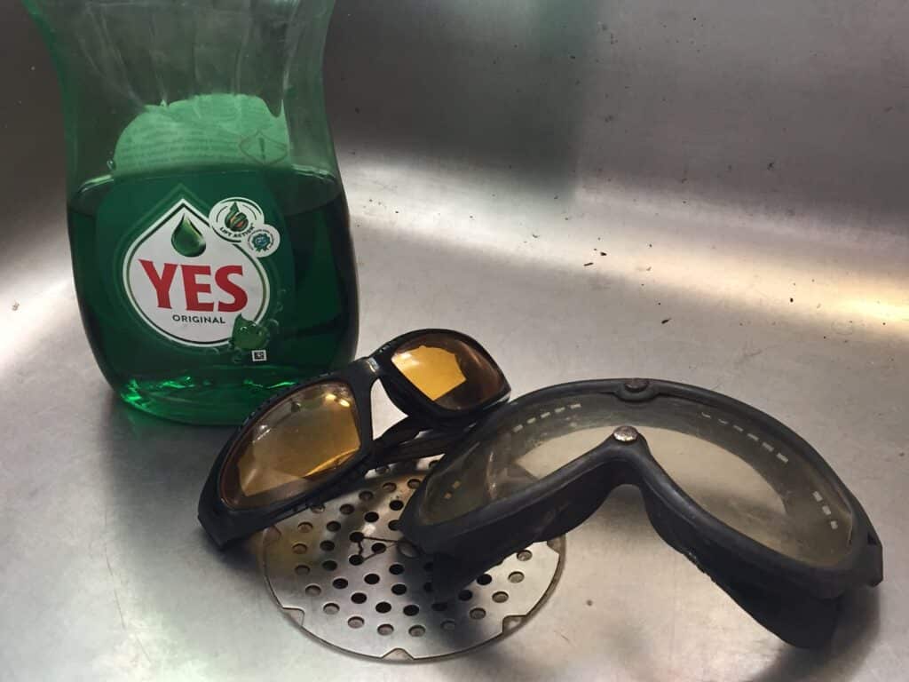 Men det finns bot mot detta och det är – handdiskmedel! Gör så här: Ta lite handdiskmedel, typ Yes, och späd det med vatten. Blandningen är okritisk men 1 del diskmedel på 10 delar vatten kan duga. Har man för mycket diskmedel i blandningen kan ytan få en suddig hinna efter torkning. Rengör ytan på visir och glasögon på bägge sidor. Häll nu blandningen på insidan (utsidan behöver inte behandlas) och luta lite hit och dit så blandningen fuktar hela ytan. Häll bort överskottet och låt det hela torka – klart!