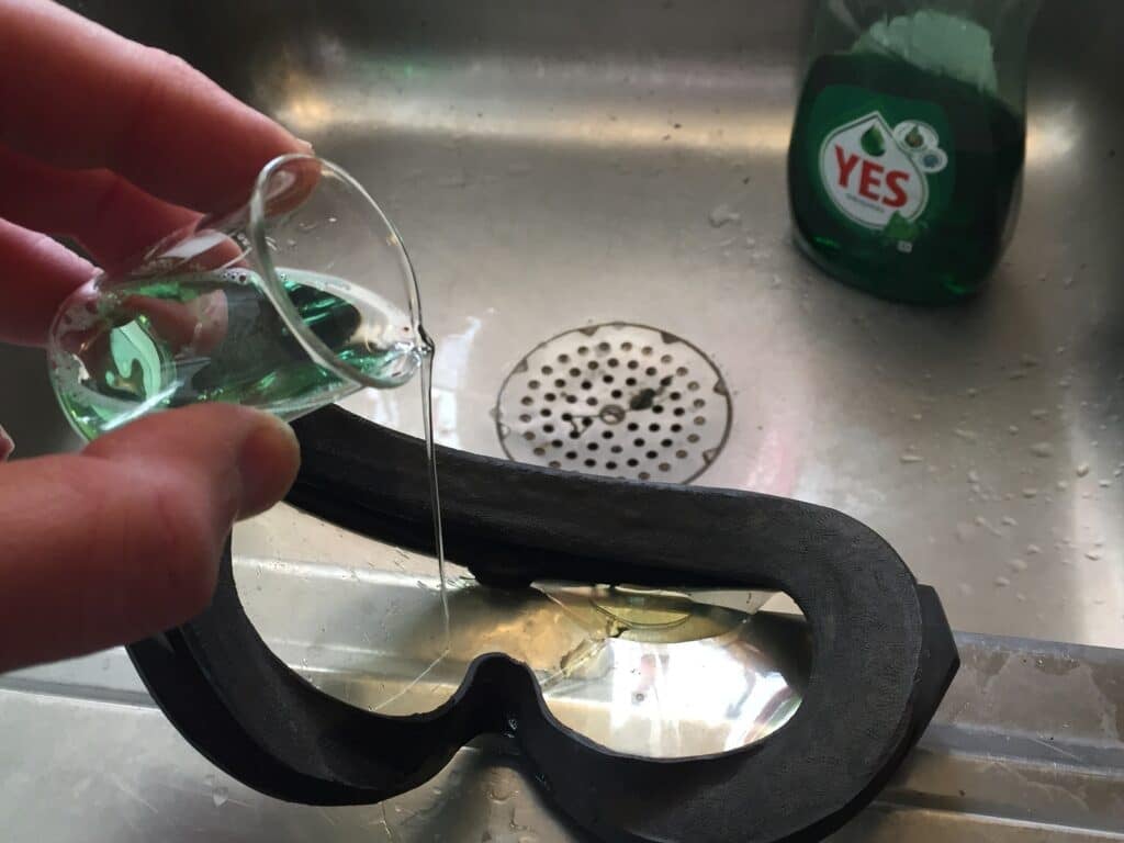 Du behöver handdiskmedel, men även tvål och liknande fungerar. När undertecknad var liten (60-talet) och låg i badkaret med mitt cyklop upptäckte jag att imman försvann om man hade på lite av skummet från bubbelbadet på insidan av cyklopet och gnuggade in det (dykare har en äckligare metod…). Det visade sig även fungera med schampo, tvål eller diskmedel (ej maskindiskmedel! =Frätande)