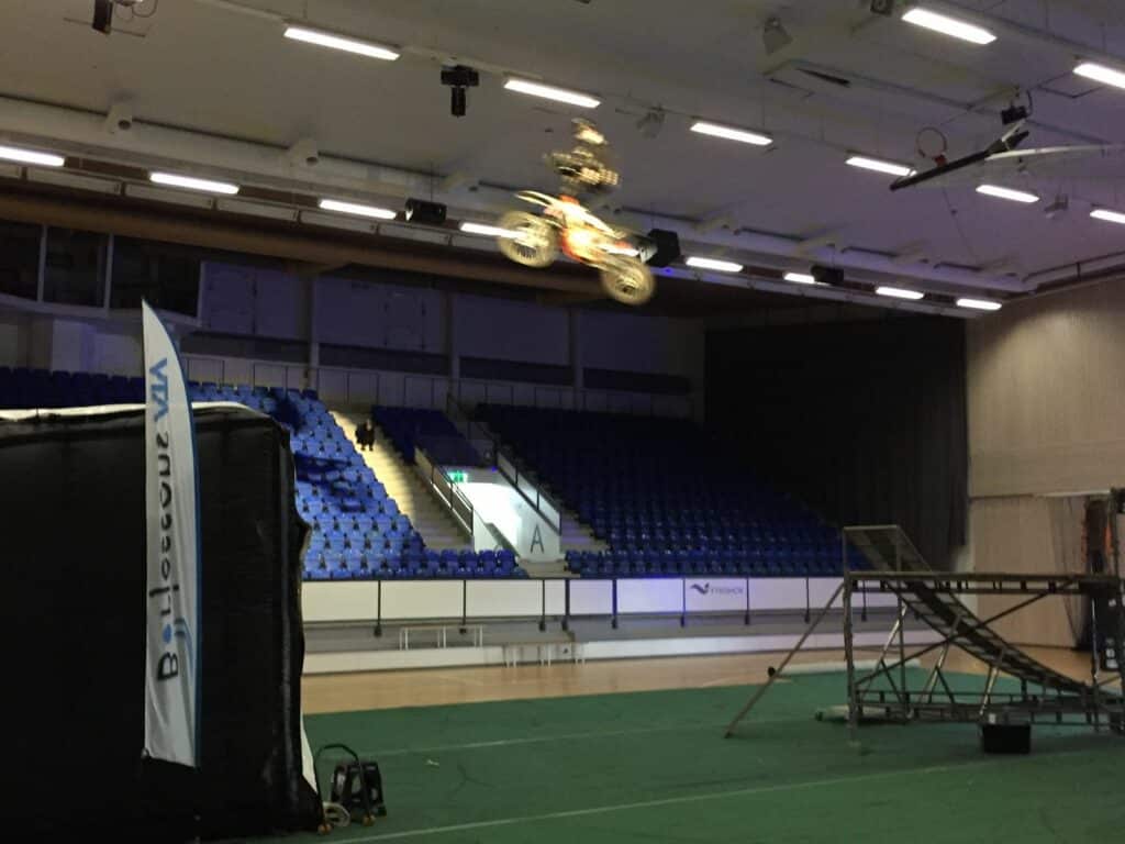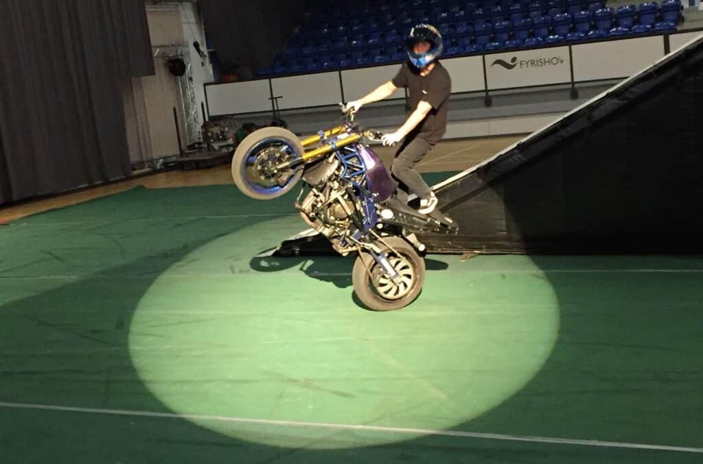 Akta taket! Men knuttarna landade mjukt på den uppblåsbara rampen till vänster.Hade man inte råd med en hel motorcykel så kunde man i alla all komma hem med en mössa!