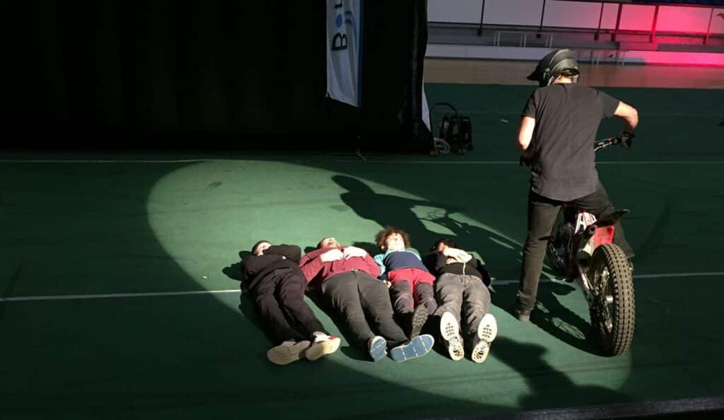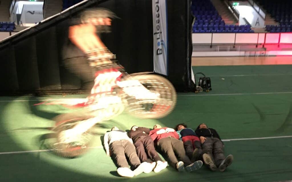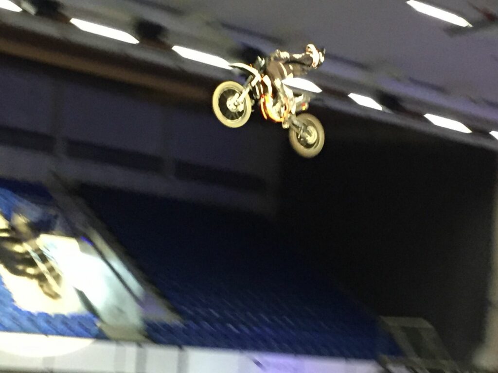 Självklart var det uppvisning i den högre skolan på mässan!”Okej – ligg nu still och dra in magarna. Allt kommer att gå bra!” Några frivilliga ur publiken ska snart bli ”överkörda”. Men en femte frivillig var redan på väg ut på banan. Föraren fick frågan om han klarar att hoppa över fem personer: ”Med nöd och näppe” blev svaret.Fast fem personer var inget problem. Alla klarade sig helskinnade och slapp få däckmönster på magarna.Med hjälp av en ramp kunde man hoppa ändå högre!