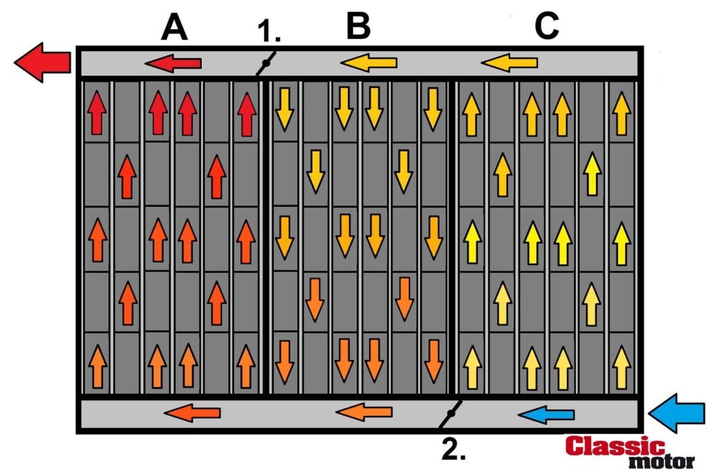 Tredje alternativet är att både serie- och parallellkoppla burkarna och på bild 1 ser vi hur jag valde att göra. Här har vi tre sektioner med rör där rören i varje sektion är parallellkopplade. Luften tar vi in nere i högra hörnet (blå pil). Genom kanalen i solfångarens botten strömmar nu luften upp genom samtliga rör i sektion ”C” och hamnar då i solfångarens övre kanal. Enda vägen ut för luften är att strömma ner genom rören i sektion ”B”. Därefter når luften botten igen och strömmar avslutningsvis upp genom alla rören i sektion ”A”. Här får luften en uppvärmning i tre steg och kan dessutom passera många rör ”på bredden” vilket ger ett högre flöde. Genom att välja tre sektioner där två går uppåt vill luften självmant strömma igenom solfångaren automatiskt då varm luft som bekant stiger. Sektion ”B” går visserligen nedåt, men måste ge sig för majoriteten där luften rör sig uppåt i sektion A & C. Så här fungerar också rökkanalerna i en vanlig kakelugn, där har vi tre rökgångar som går uppåt, men bara två som går nedåt. Tre är fler än två. Men det räcker inte med självdrag i en solfångare – vi måste ha en kraftig fläkt som pressar luften genom solfångaren om det ska bli effektivt.