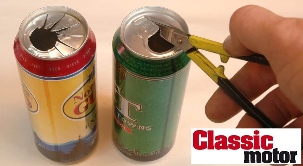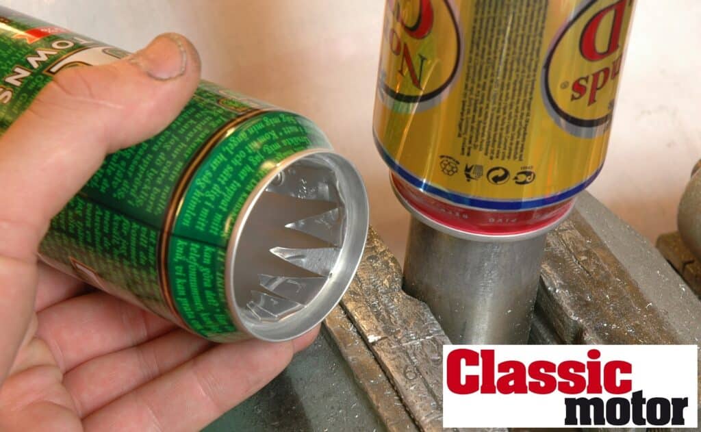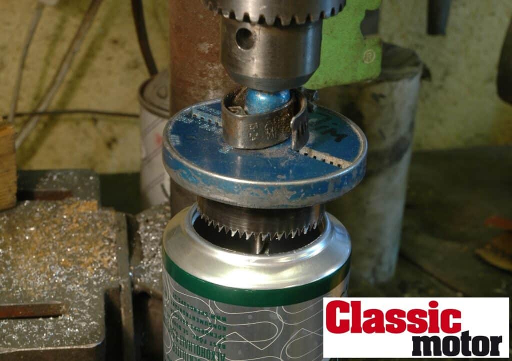 Okej – vi kör igång direkt! Ring alla vänner, släktingar och grannar och tigg till dig massor av tomburkar. Det går åt 90 burkar per kvadratmeter. Kolla även i dikena när du är ute och åker. Första åtgärden blir att borra ur botten på alla burkar med en hålsåg på cirka 45 mm som på bild 2. Burkarna är tunna och sköra så det krävs lite träning för att få ur botten utan att knyckla till burken. Nästa åtgärd blir att ta ur locket, men det ska inte bort helt, utan vi klipper upp det till en ”stjärna” som vi sedan viker in i burken (bild 3). Jag satte en grov bult i skruvstycket som jag trädde burkarna över så att stjärnan viks inåt (bild 4). Tanken med dessa plåtflikar är att de ska skapa lite turbulens som gör så att luften spolar effektivare mot burkens väggar och inte bara blåser igenom burkens centrum.