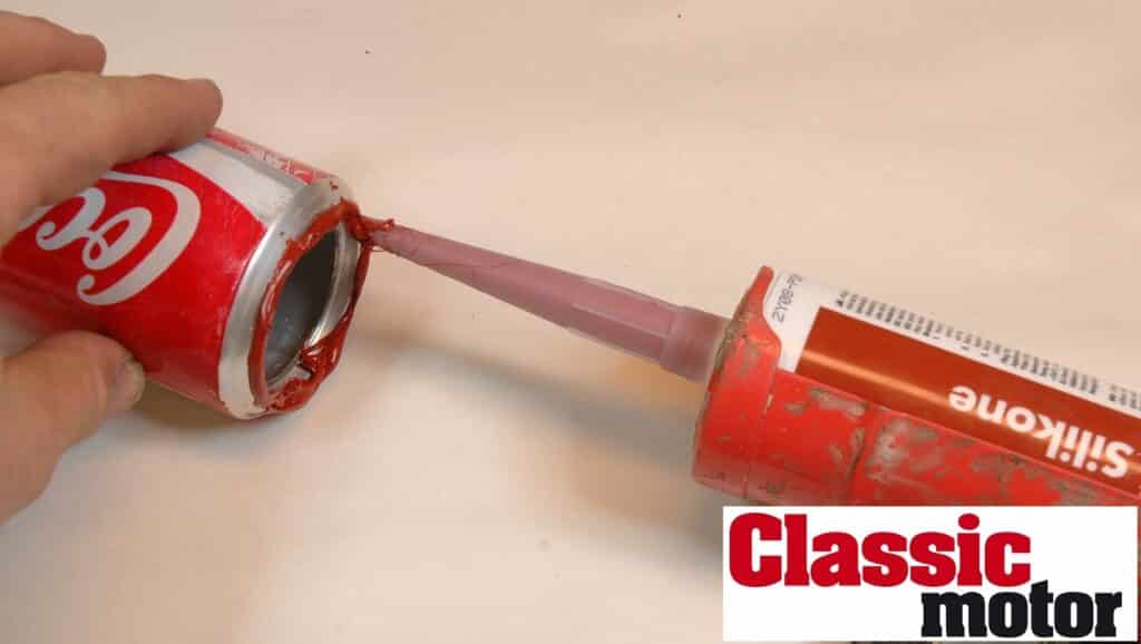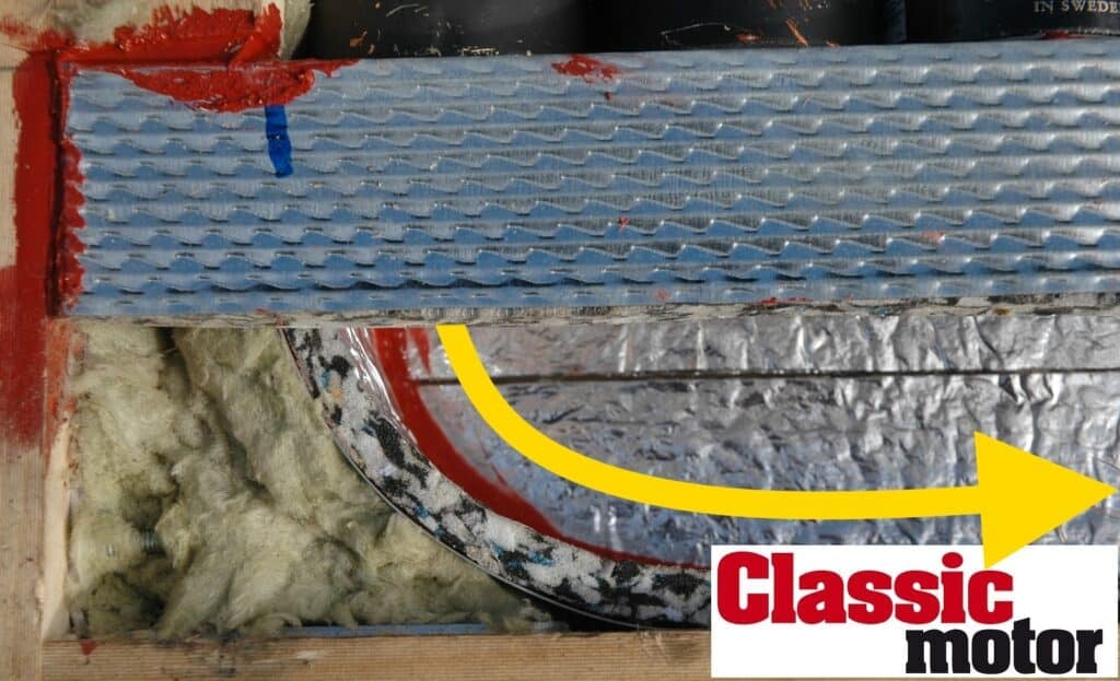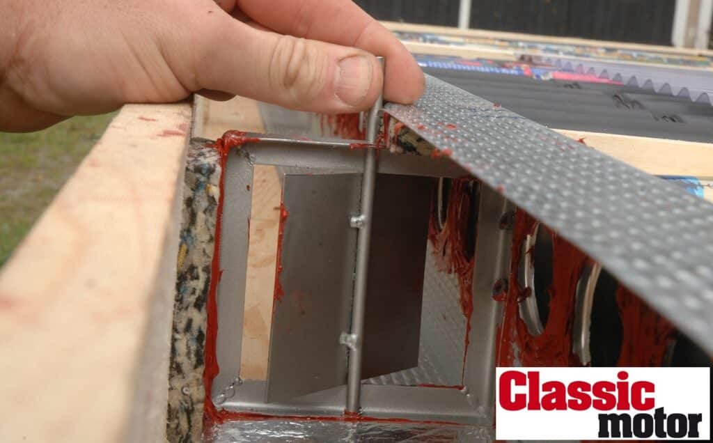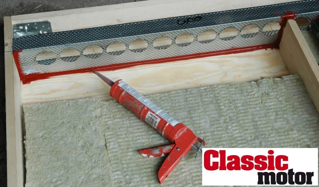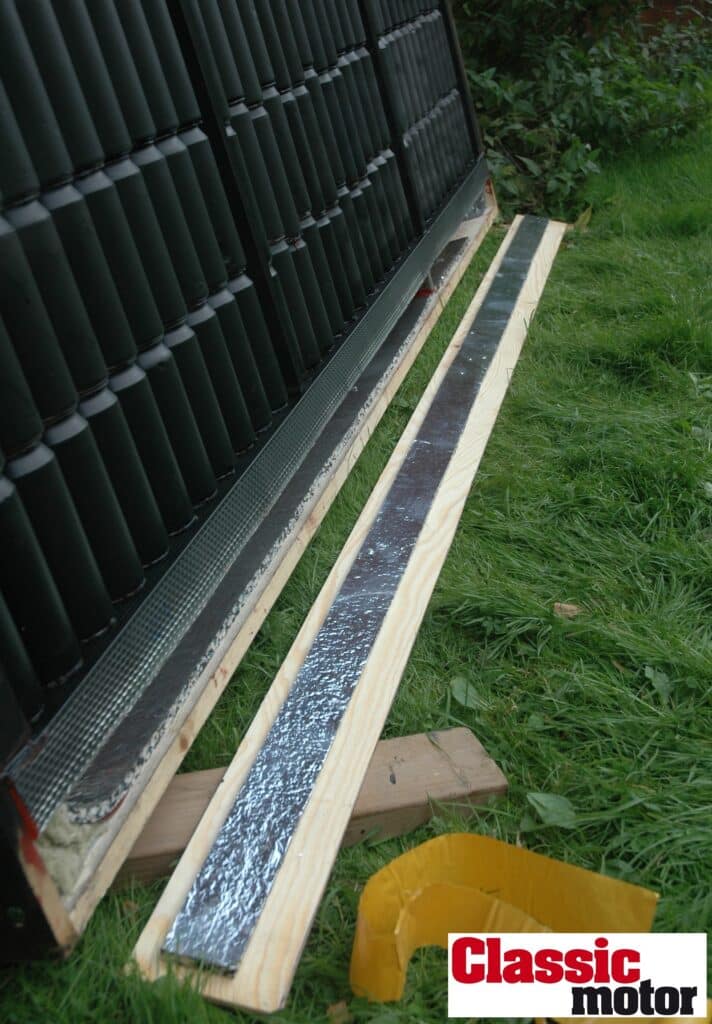Funktionen hos en solfångare, eller ett växthus med för den delen, är att man har en plast- eller glasskiva som släpper igenom solljuset. När solljuset träffar de svartmålade aluminiumburkarna så omvandlas ljuset till värme. Det fina i kråksången är att plasten/glaset inte släpper igenom värme! När ljuset omvandlas till värme kan inte energin reflekteras ut igen, utan fångas bokstavligen under glasskivan och enda vägen ut är då att absorberas av burkarna och ut via luftkanalerna i över- och underkant. Fast det finns ju smitvägar och det gäller att isolera solfångare så att värmen inte hittar ut. Förutom att vi har 50 mm Rockwool under burkarna så drevar vi även sidorna med samma isolering (bild 12). Men det är inte bara värmen som vill smita ut – även den uppvärmda luften måste hållas kvar inne i burkarna och kanalerna. Varmluften får inte läcka in i utrymmet mellan kanalerna där burkarna sitter. Då kan den läcka ut ur solfångaren och kan till och med spräcka glaset av trycket om man har en kraftig fläkt och stora glasytor. På bild 13 har vi därför kletat på ett extra varv silikon runt varje hål där burkarna ansluter till kanalen.