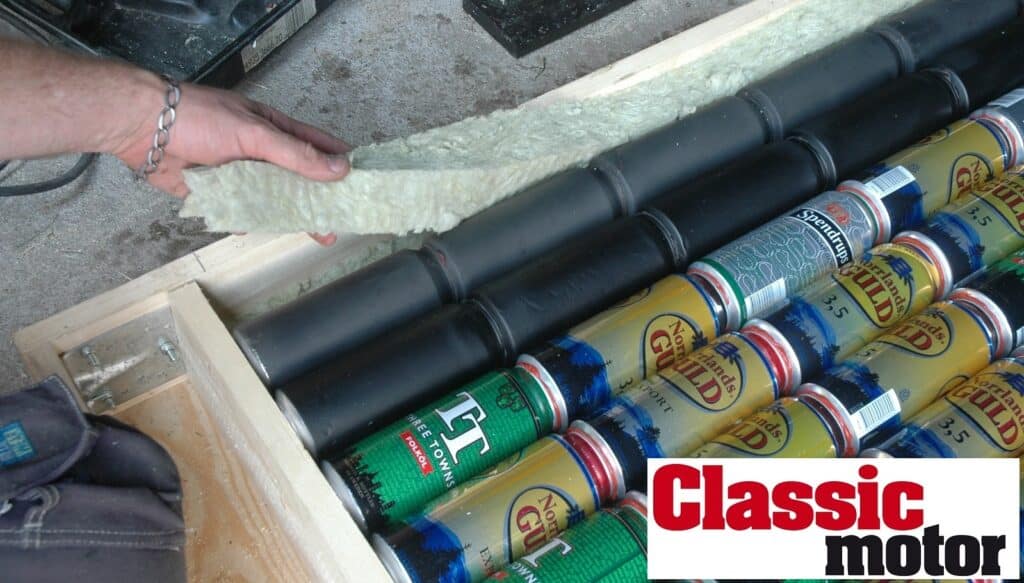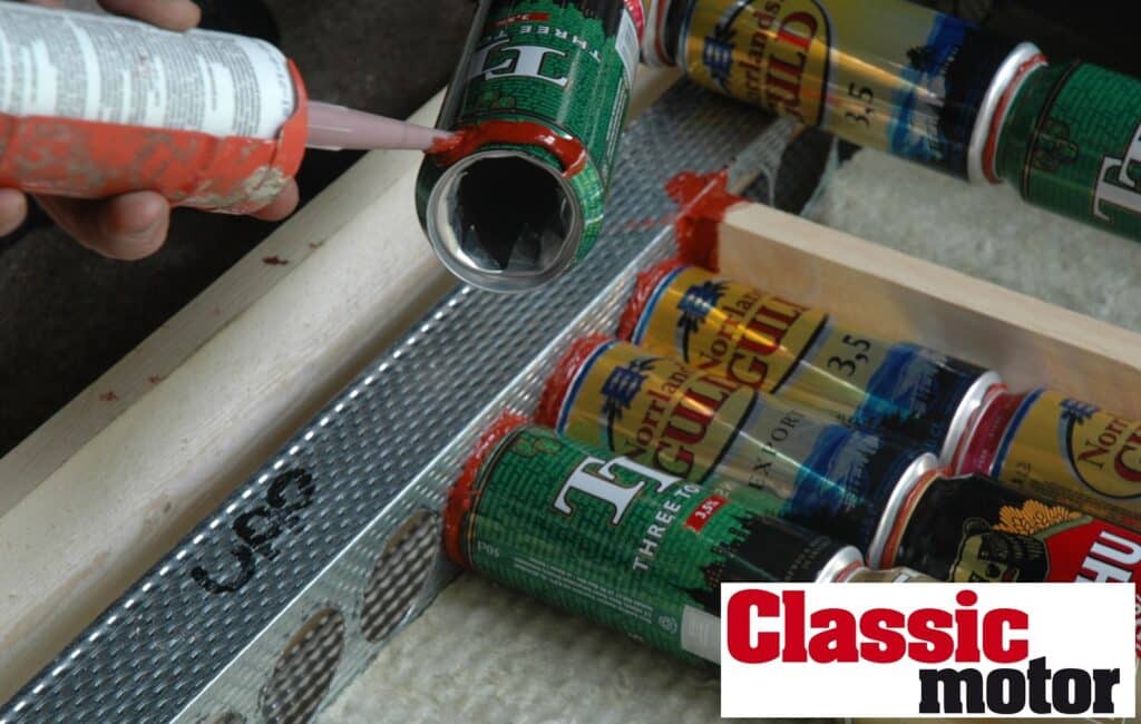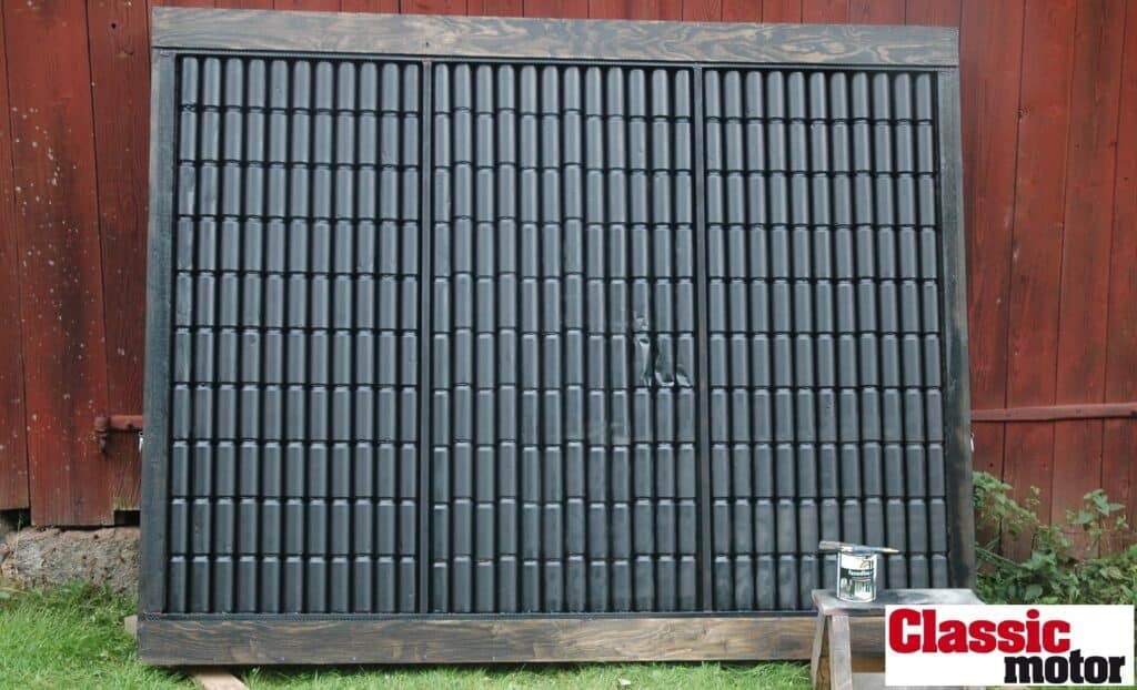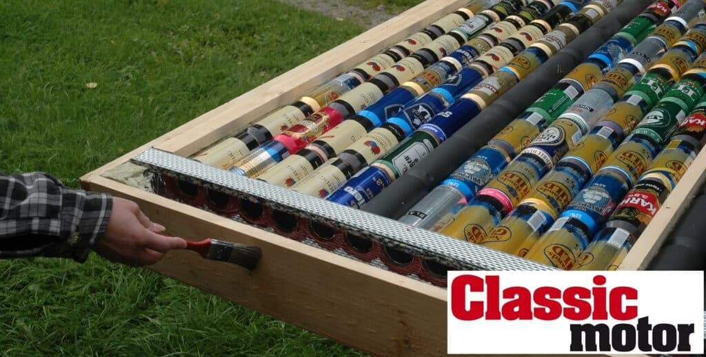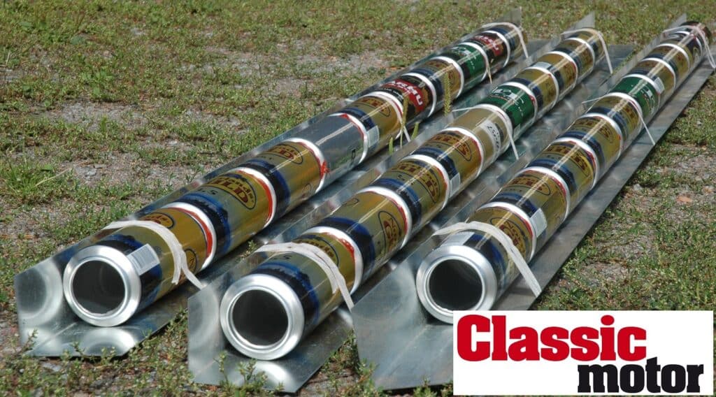 Elpriset bara stiger medan temperaturen sjunker. Att hålla varmgrader i garaget eller verkstaden under vintern kan bli en kostsam historia. Jag har länge funderat på att fixa någon form av tillskottvärme i garaget och då har tankarna gått till vanliga solfångare med vatten som värmemedium. Principen är enkel – man har en massa svartmålade kopparrör i en isolerad låda. Rören, och vattnet, värms av solen och pumpas vidare in i garaget där det via ett element släpper ut värmen så att både oljor och fingrar mjuknar upp. Det som stoppat mig hittills är det faktum att vatten kan frysa – man måste se till att ha glykol eller liknande i systemet. Vatten kan också koka – blir det för varmt så kokar systemet och skador kan uppstå. Vatten kan även läcka – ett lite hål någonstans och man har huset eller gräsmattan full med glykolblandning. Efter en del sökande kom lösningen – luft! ”Luft fryser inte” för att citera en känd biltillverkare. Luft kokar inte heller och ställer inte till med vattenskador. En extremt rolig idé som jag sedan sprang på var en solfångare byggd av – ölburkar! Burksolfångaren lär ha sitt ursprung från Ungern, men det finns de som med framgång byggt denna typ av solfångare på våra breddgrader.