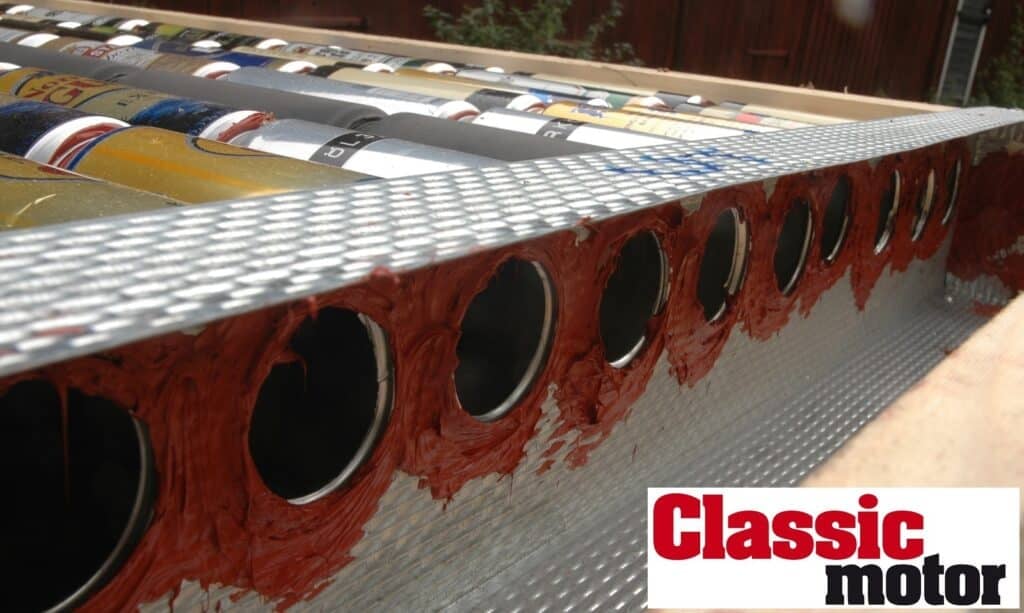 Själva lådan gjorde jag av vanlig plywood med måtten 120×244 cm. Tjockleken kan vara 9-12 mm. För enkelhetens skull fick bredden på solfångaren bli 244 cm – samma som plywoodskivan. Höjden blev 200 cm för att passa tio burkars höjd samt en kanal på 120×120 mm i över- och underkant. Ramen runt lådan görs av vanliga brädor med måtten 120×22 mm som skruvades fast i plywooden (bild 8). Med tanke på att värmen kan bli hög så gjorde vi kanalens ena vägg av en plåtregel, 120×50 mm, där burkarna sedan fästs med silikon. Sedan borrades 34 hål (c/c 66 mm = burkdiameter) i plåten (bild 9). Den färdigborrade plåtregeln fästs sedan med skruv i ram och botten så att kanalen blir 120 mm i fyrkant och tätas sedan med silikon (bild 10). I lådans botten ligger det 50 mm rockwool som isolering så att ingen värme smiter ut. Sedan får varje rör en klick silikon i änden och trycks in i sitt hål (bild 11). Nu sätts burkarna i spänn medan silikonet härdar. Ta en pilsner så länge!