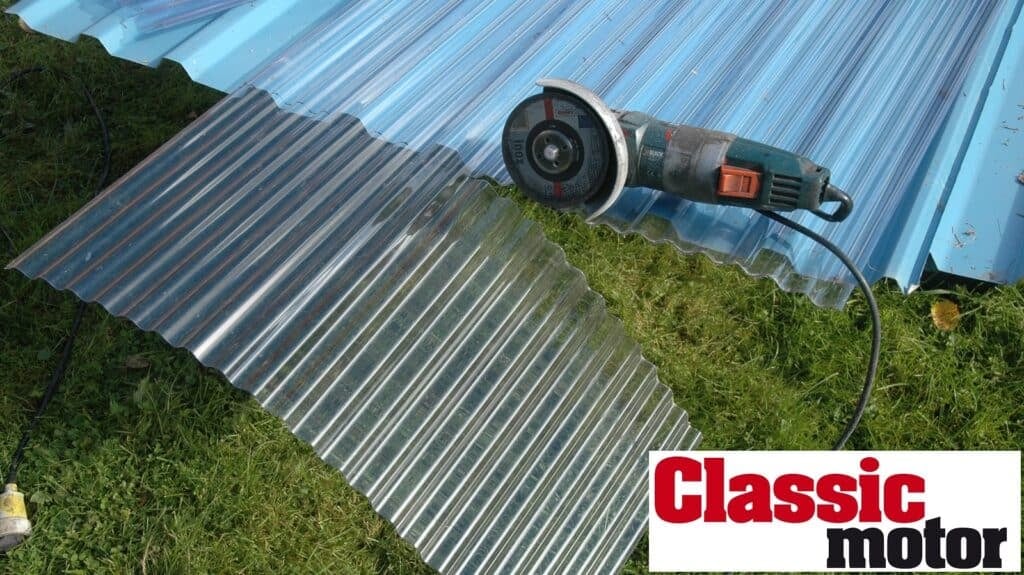 Plastskivorna håller måtten 66×200 cm och om de ska kapas fungerar det bäst med vinkelslipen (bild 22). Om man använder en såg så vill sågtänderna gärna hugga i plasten med långa sprickor som följd. Vinkelslipen ”smälter” sig igenom plasten. I övrigt är skivorna väldigt tåliga mot omild behandling. Vår solfångare är 244 cm bred (plywoodskivans maxmått) vilket kräver fyra korrugerade plastskivor för att täcka hela fronten. Skivorna fästs i solfångaren med farmarskruv, vilket är en skruv med borrspets som tar sig igenom plasten utan att spräcka den (bild 23). Under skruvskallen sitter det en tjock gummibricka som tätar mot underlaget. Här ska man inte dra för hårt, utan bara så att gummibrickan komprimeras en aning. Annars finns det risk för att plasten reser sig från träet mellan skruvarna med värmeläckage som följd. Man skruvar också i ”dalarna” och inte uppe på ”åsarna” i plasten. För att det ska bli tätt i över- och underkant så använde vi en icke torkande fogmassa av liknande sort som man tätar bilrutor med. I underkant satte vi en galvad plåtvinkel som syns längst ner på bild 24. Denna går upp bakom skivorna och har ett fall utåt så att allt vatten som rinner nerför plastskivorna rinner av utan att rinna på plywoodlocket under.