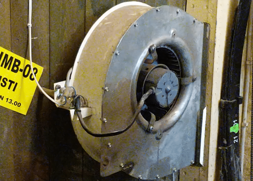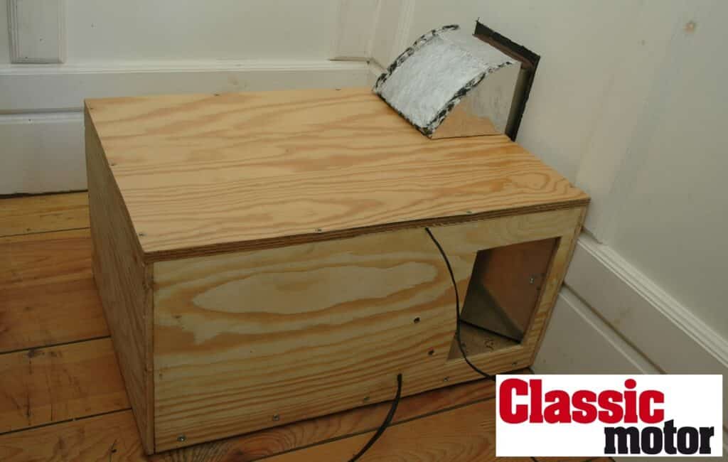 Nu fortsätter vi på andra sidan husväggen, alltså inne i huset. Nere vid golvet i rummet har vi nu ett hål där luften ska tas ut till solfångaren. Uppe vid taket på samma vägg har vi det andra hålet där den varma luften kommer in efter att ha passerat solfångaren. För att få effektivitet så använder vi en fläkt för att driva luften genom solfångaren. Här kan man välja två metoder. Antingen sätter man en fläkt nere vid golvet och blåser in luften i solfångaren, eller så sätter man fläkten uppe på väggen och suger ur luften ur solfångaren. I det i första fallet får man ett övertryck i solfångaren och i det senare fallet får man ett undertryck i solfångaren. Vad som är eventuellt är bäst ur ett fysikaliskt perspektiv kan jag inte svara på, men jag valde att sätta fläkten nere vid golvet så att den trycker in luften i solfångaren. Fördelen med detta är att fläkten bara får arbeta med rumstempererad luft. Dessutom kan man gömma den och ljudisolera den. Jag byggde in min fläkt i en plywoodlåda som är isolerad invändigt med 20 mm motorrumsisolering (bild 26). På lådans topp sitter det ett fyrkantigt rör som sticks in i det fyrkantiga hålet i väggen. Röret har en gummitätning runt änden som tätar inne i hålet. Tänk bara på att kanalen genom väggen är hundra procent tät så att inte fuktig rumsluft trycks in i isoleringen i ytterväggen då detta kan leda till fuktskador inne i väggen på sikt.