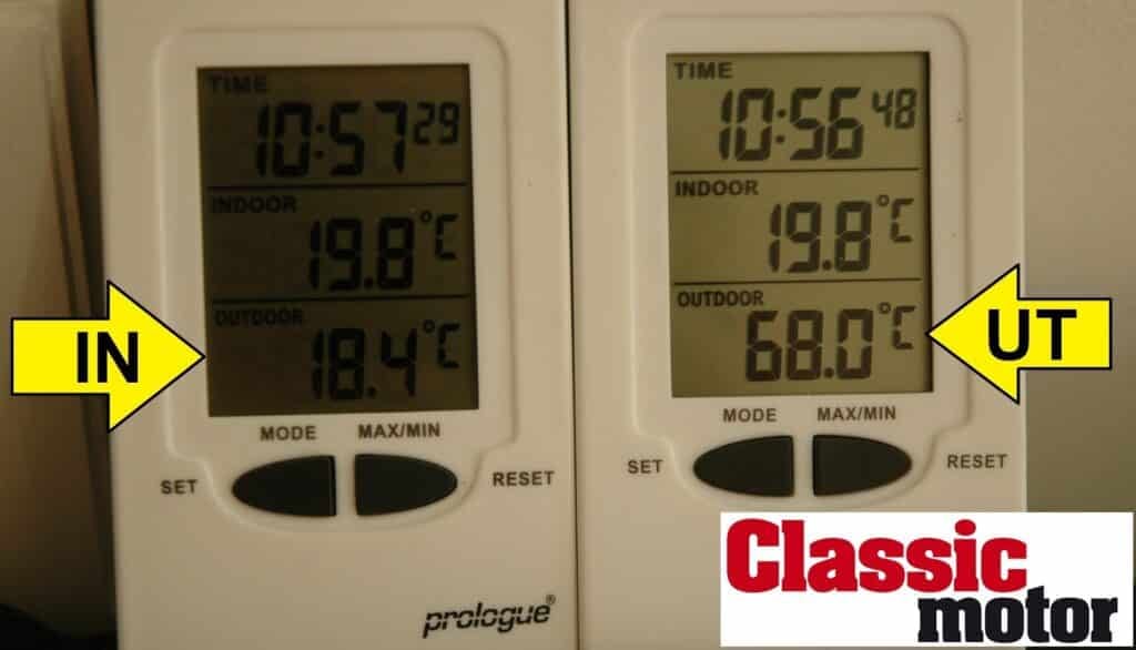För att ha koll på temperaturen inhandlades två billiga inne/ute-termometrar. Ena termometerns givare placerades inne i fläktlådan och mäter inkommande temperatur till solfångaren. Den andra termometerns givare placerades i hålet uppe vid taket där värmen kommer ut. På bild 27 ser vi hur det kan se ut under drift en oktoberdag med 10 plusgrader ute. Längst ner på termometrarna ser vi vad givarna i fläktlådan och utblåset uppe vid taket mäter. På den vänstra termometern ser vi att lufttemperaturen vid golvet där fläkten suger luften ligger på 18,4 grader. På den högra termometern ser vi hur varm luften är när den kommer tillbaka in i huset igen: 68,0 grader. Solfångaren höjer här temperaturen med nästan 50 grader. Rummet där varmluften kommer in ligger på dryga 20 kvadratmeter och vid ett första test ökade temperaturen i rummet från 15 till 20 grader på 90 minuter och då var samtliga dörrar till övriga huset öppna. Inte illa då det enda som drar energi är fläktmotorn på ynka 70 watt.