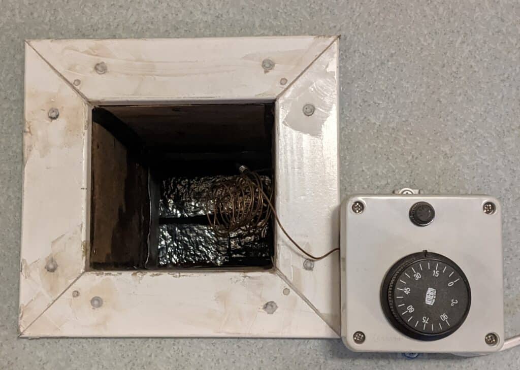 Man måste ha en termostat som startar fläkten när det finns sol och stänger ner den när solen gått ner eller döljs bakom moln. Jag använde en så kallad differentialtermostat vilken kan slå på eller slå av strömmen beroende på hur man kopplar in den. Till skillnad mot termostaten i ett värmeelement ska denna termostat slå på strömmen när temperaturen uppnår inställd temperatur. Jag har inte gjort några effektmätningar ännu, men räknar med att kunna få ut cirka 2 kilowatt ur solfångaren. Man ska inte stirra sig blind på temperaturen då luftmängden är lika viktig. Har man ingen ström där man satt upp solfångaren kan man använda en 12-voltsfläkt som drivs av en solpanel. Då sköter det hela sig automatiskt – ingen sol, ingen ström till fläkten och omvänt. På våren när utevärmen kommer tillbaka vill man ju inte ha mer värme i huset och då kan man inte bara stänga av fläkten. Värmen i solfångaren måste ledas bort och har man då ett kallrasspjäll kan inte hetluften i solfångaren ersättas med sval luft. Enbart självdraget (varm luft stiger) räcker sällan till att öppna kallrasspjället). Därför täcker man över solfångaren sommartid (eller bär in den i logen som undertecknad) så den inte tar skada av värmen från solljuset när den inte har fläkten ansluten.