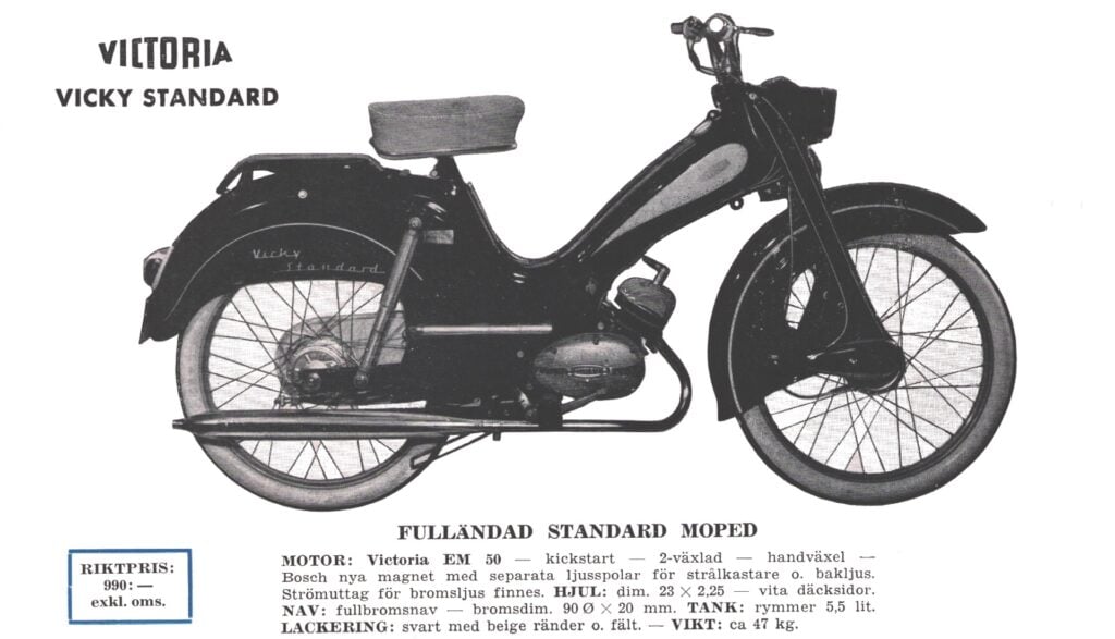 Sommarmånaden juli har kommit. Denna gång parkerar vi en Victoria Vicky från 1961 vid milstenen. Modellen heter K61 och har en motor som är ett resultat av en sammanslagning av tre tyska mopedtillverkare: Victoria, DKW och Express. Efter sammanslagningen kallades motorerna dels för Victoria EM 50, men även för Zweirad Union (Tvåhjulsunionen). Mopeden på bilden har den tvåväxlade motorn med handväxel och kickstart.Andra varianter på K61 var Vicky Standard som i stort sett var identisk med K61. Från 1961 blev det tillåtet att ha kick istället för pedaler på svenska mopeder och Victoria var snabba med att presentera en kickmotor.Mopeden såldes även under namnet DKW Hummel.