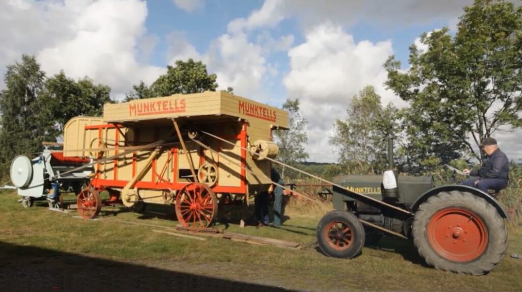 Det är skördetider och stora självgående tröskor härjar på åkrarna i vårt land. Men hur gjorde man förr? Se filmen om ett stationärt tröskverk från Munktells.