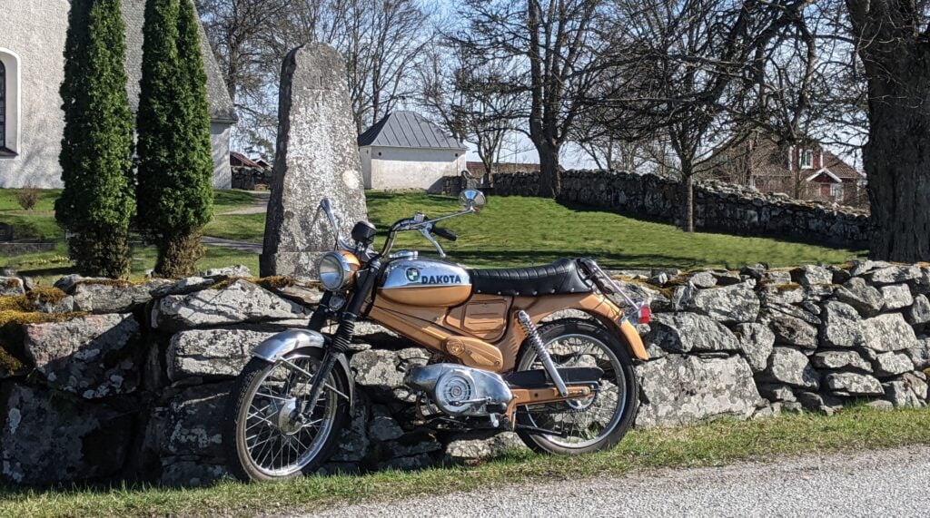 Nu har vi kommit in i maj månad och våren har äntligen kommit. Denna gång har vi parkerat en Puch Dakota från 1974 vid milstenen.
