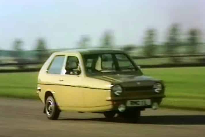 Brittisk tv testar nya Reliant Robin 1974, som en knorr på projekt "Grisen i säcken"