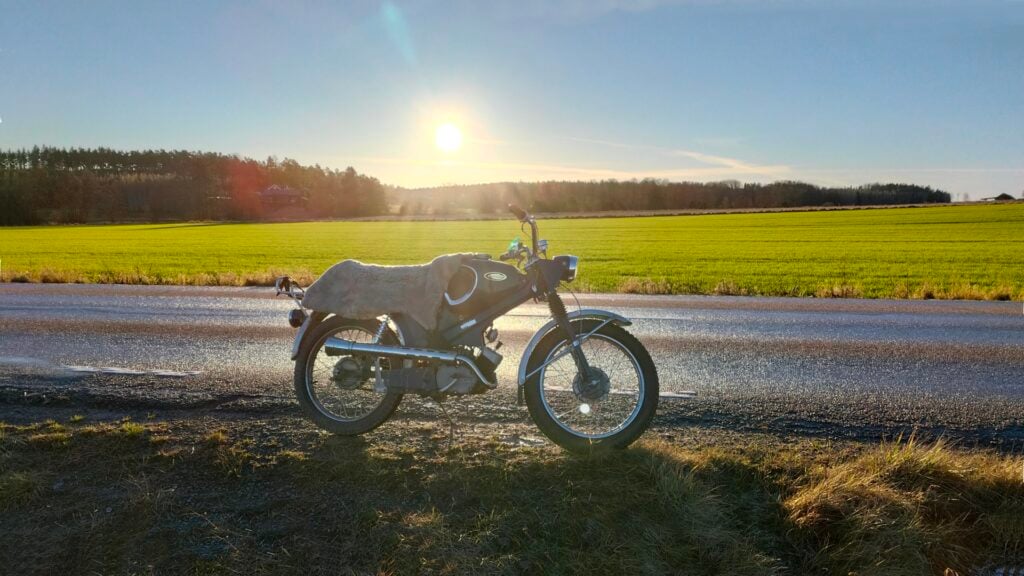 Nu när jättelampan äntligen dök upp blev det dags för en mopedtur. Min vintermoped, en Crescent Topper från 1967, startades upp och sen bar det iväg på solbelysta vägar. Här skulle lapas sol. Med solen i ryggen första biten gick Toppern aningen fortare (kändes det som) och alla bilar jag mötte hade nerfällda solskydd. Någon förare höll till och med ena handen ovanför ögonen likt en spejande indian. Det var som att vi alla var ovana vid solens närvaro.