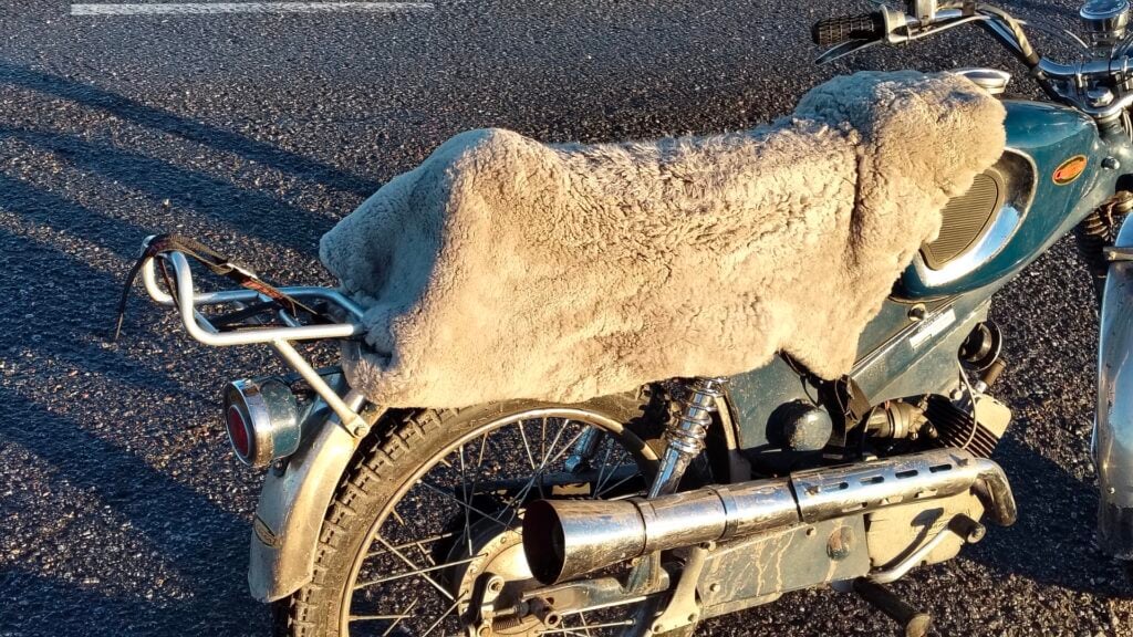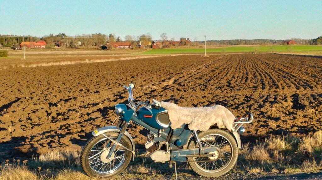 Titta – skuggor! Efter en evighet av gråmulen himmel syns skuggor igen. Det betyder ju att det i andra änden finns något som lyser.MCB Topper, VoV 1215, från 1967 är ett utmärkt vinterfordon med sina rostfria skärmar som tål vägsalt. Min Topper är dessutom till största delen i bruksskick så lite smuts och sand från vintervägar stör mig inte ett dugg. Husqvarnamotorn startar senast på fjärde kicken i minusgrader och tickar sedan på som ett urverk. Vill du läsa mer om denna Toppers återkomst från åratal i en loge skriver du bara i Projekt Topper i sökrutan uppe till höger.En tjock fäll över sadeln värmer gott under vinterfärder. Tanken var att fällen skulle tas av på sommaren, men då Topperns dyna är väldigt hård har fällen fått sitta kvar året runt. Jag har suttit på stenar som varit bekvämare. Dessutom har jag stoppat in en bit liggunderlag under fällen för att ytterligare öka komforten något.