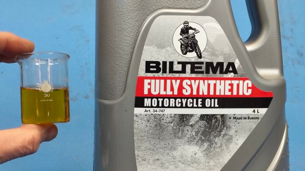 Till saken hör att jag har tankat flera av mina tvåhjulingar med Biltemas syntetolja utan några som helst problem – men alla dessa har haft en liggande tank där man lätt kan spruta bensin i alla hörn och vrår i tanken så att det inte uppstår några oljefickor. Nästa gång Vickan ska tankas får jag dutta med lite olja, tanka lite bensin, skaka moppen, dutta i mer olja och lite mer bensin, skaka igen och upprepa denna procedur tills tanken är full. För jag vill ju inte ha en ”blandningsdunk” med mig när jag ska tanka.