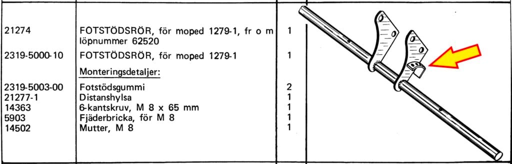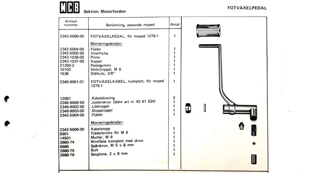Jag tror att denna typ av växelarrangemang är lite ovanlig och då kan det vara svårt med delar. Men kolla med exempelvis Rösebäckens Cykel och Motor om de kan ha delarna på hyllan. Fotpinnebryggan på MCB 1279-1 skiljer sig från exempelvis MCB 1279 och andra mopeder då 1279-1 har ett segment för växelpedalen som ska hålla vald växel i läge.