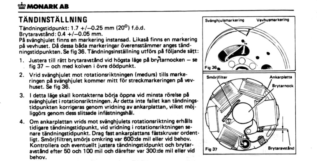 Svar: Det enda jag har är Monarks information om flakmopeden med denna motor enligt bilden längst ner. Tyvärr så framgår det inte något om abrissmåttet, men om brytarna är i bra skick så hamnar abriss rätt om man ställer brytaravståndet enligt manualen.