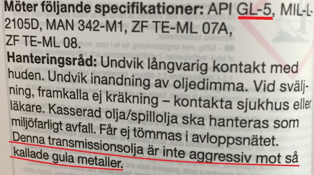 Men har du gott om GL5-olja kan du kolla om den fungerar ihop med gulmetaller. I så fall häller du den i växellådan på dina fordon. Om den inte är snäll mot gulmetaller kan det mycket väl vara så att den är avsedd att klara belastningen i hypoidväxlar (bakaxlar) och då kan du använda den där istället. Men kolla med tillverkaren först.