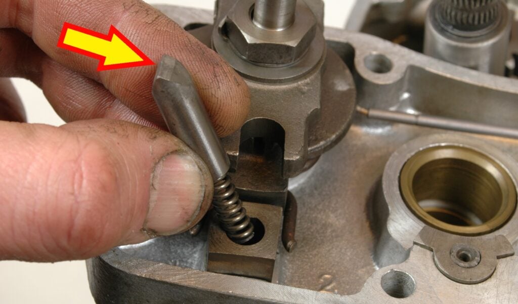 Om en växel vill hoppa ur kan det antingen bero på att den spetsiga plungern, som med en fjäder ska hålla vald växel i läge, antingen är sliten – eller har en fjäder som tappat spänsten. Plungern går in i hacken på växelsegmentet (pilen övre bilden).