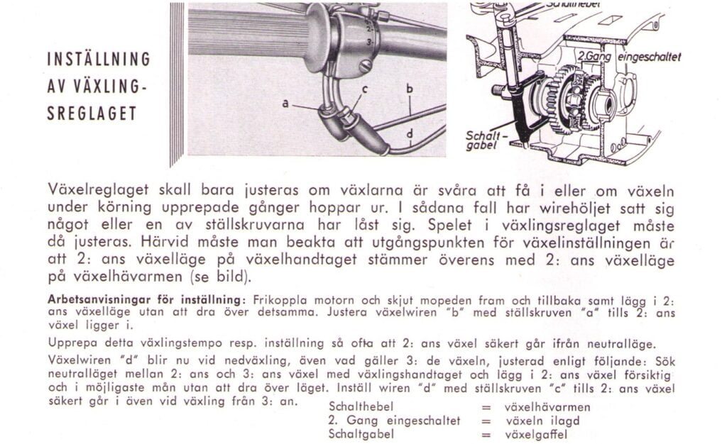 Svar: Den bakre vajern (”d” på bilden nedan) på växelhandtaget är den som spänns när man vrider handtaget mot ettans växel. Nu har jag inte skruvat med den handväxlade Zweirad Union-motorn men det är lätt att hitta ettans växel på motorn. Ställ upp mopeden på centralstödet så bakhjulet hänger fritt.