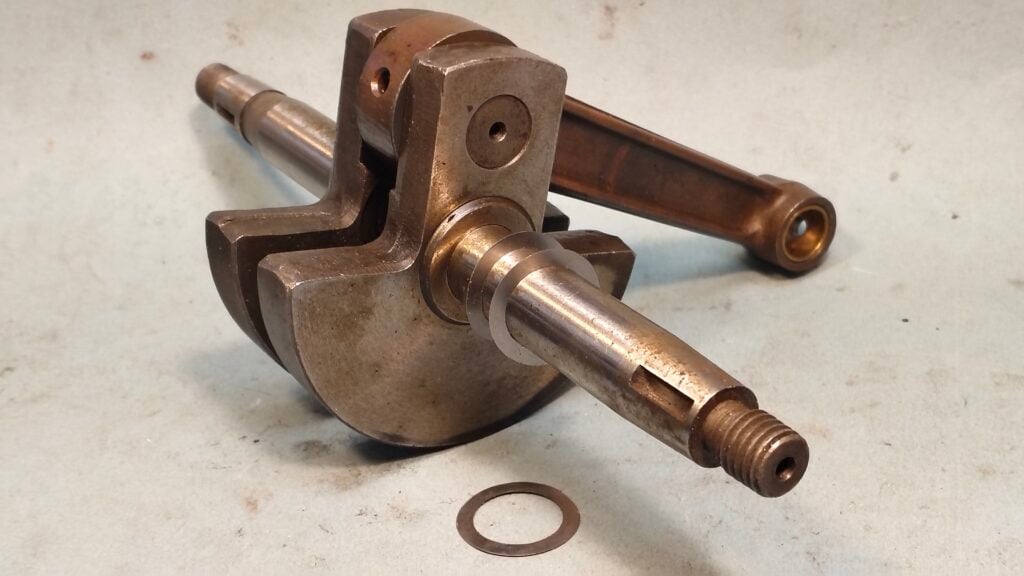 Men då Husqvarnamotorn har en transkedja kan det vara idé att kolla hur vevaxeldrevet linjerar mot kopplingsdrevet med en stållinjal. Det kan hända att man ändå bör lägga mer shims på ena sidan om det förbättrar linjeringen. Kolla bara i så fall att någon av vevskivorna inte tar i vevhusväggen.