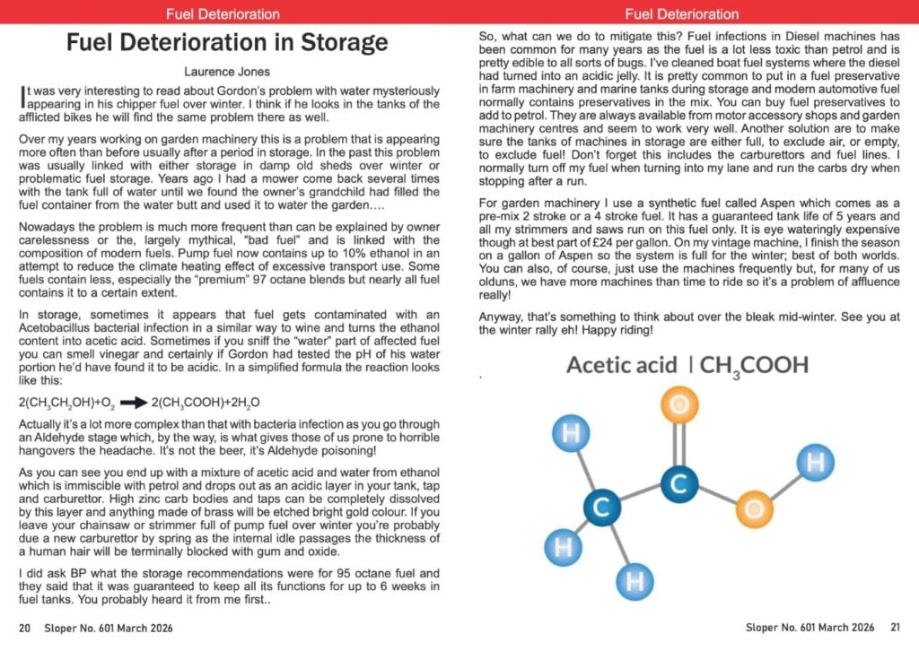 Inte en fråga men en trolig förklaring varför modern E10-bensin kan orsaka problem. Bifogar artikel om hur ättiksyra bildas. Kopierat from Sloper nr 3 2026. Sloper är tidningen för (den numera internationella) klubben POC (Panthers Owners Club) för oss med Panther-MC.