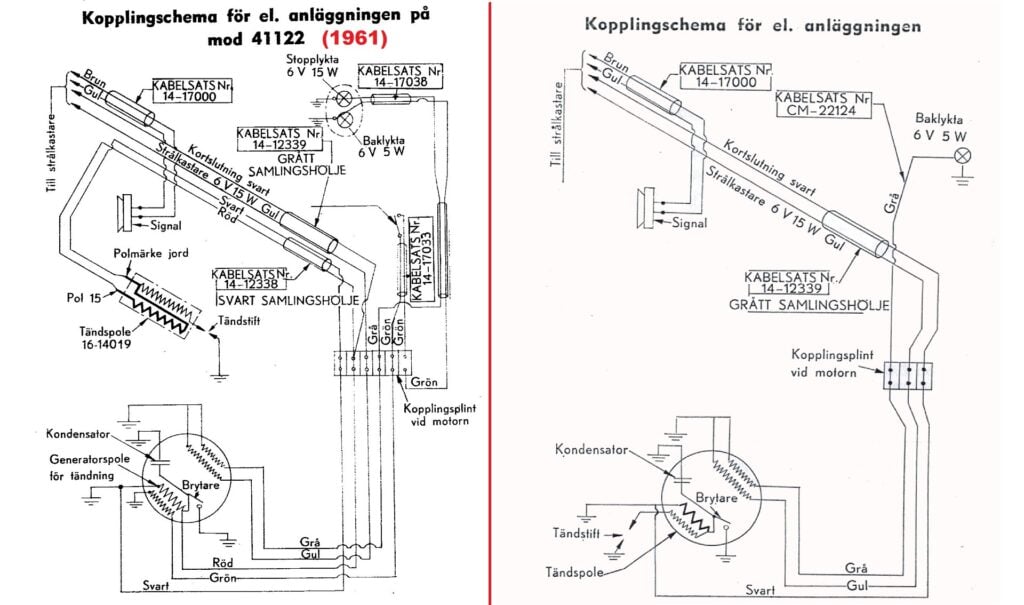 På det två övre kopplingsscheman är det ett före bromsljusepoken och ett efter. På bilden nedan syns det tredje alternativet med en ljusspole som har två lindningar.