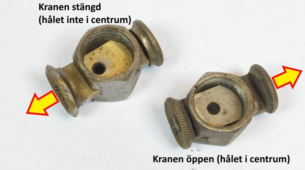På den nedre bilden syns en vridkran. I kranens hus finns det tre hål. Ena hålet är ”på” andra hålet är ”reserv” och det tredje hålet är ut från kranen (ner till förgasaren). I själva vredet finns två hål som är förbundna med en kanal och beroende på hur vredet står så har man antingen läget ”på”, ”reserv” eller ”av”. Mellan huset och vredet sitter en packning som vredet ligger mot.