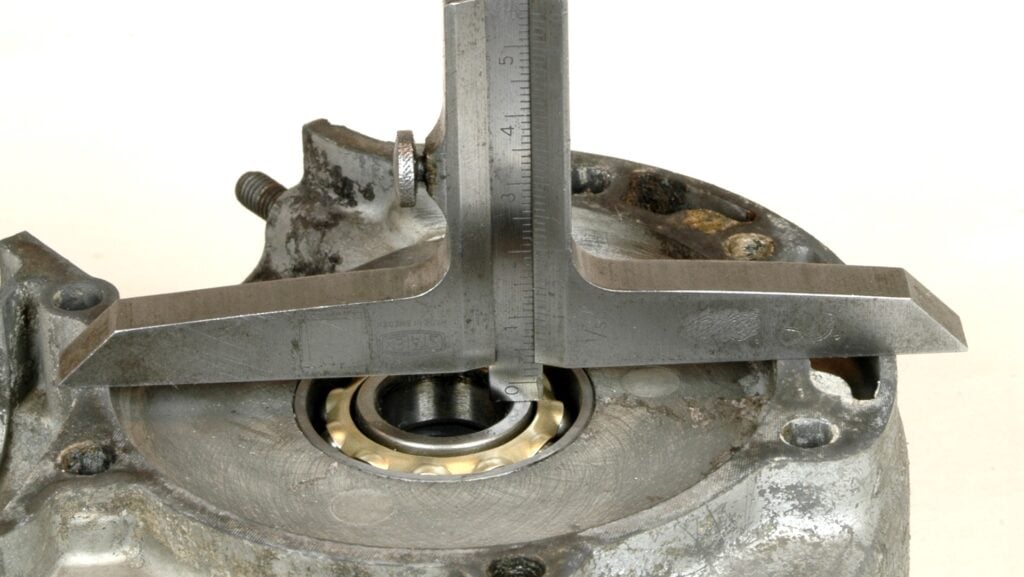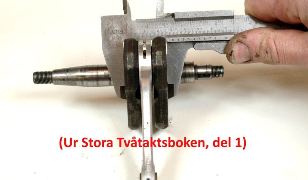 Sedan mäter du upp bredden på vevaxeln (bild nedan). Dra nu detta mått från de tidigare måtten för lagerlägena. Ett exempel: Vänster ramlager sitter på ett djup av 23,20 mm och höger ramlager sitter på ett djup av 24,50 mm. Vi lägger ihop dessa mått och får då 23,20 + 24,50 = 47,70 mm. Till detta mått lägger vi till packningens tjocklek på 0,20 mm och då får vi totalt 47,90 mm. Detta är alltså avståndet mellan ramlagren när motorn är monterad.