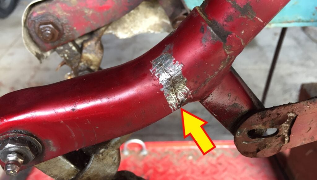 Men hur som helst – jag har en Svalette från 1956 med likadan gaffel som din och där hade gaffeln spruckit under aluminiumkåporna som täcker bottenlänkarna – på båda sidorna (se bild nedan). Det kan vara idé att kolla det på din moped så du inte råkar ut för någon olycka.