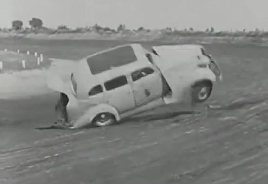 Redan på 1930-talet utförde man tuffa test på nya bilmodeller. Här utför man ”tortyrtest” på 1936 års Plymouth. Prova inte detta hemma!