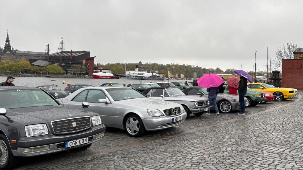 Väderutsikterna var inte de bästa. Trots det samlades cirka 60 bilar i regnet på Skeppsholmen vid årets första Bil & Bulle.