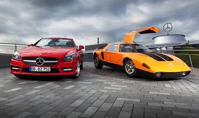 När Mercedes presenterar sin nya sportmodell SLK 250 CDI tar man hjälp av gamla rekordmodellen C111 II D från 1976.
